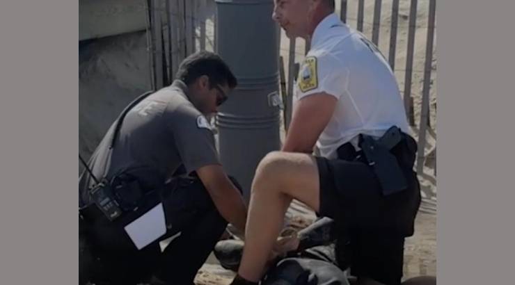 The arrest unfolded in front of several beachgoers, including children, near a shoreline walkway. Some onlookers can be heard protesting the police’s actions, with one yelling, “Get off of him!” and another noting that the incident was frightening children.