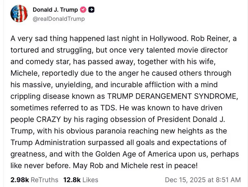 Trump wrote: “A very sad thing happened last night in Hollywood. Rob Reiner, a tortured and struggling, but once very talented movie director and comedy star, has passed away, together with his wife, Michele, reportedly due to the anger he caused others through his massive, unyielding, and incurable affliction with a mind crippling disease known as TRUMP DERANGEMENT SYNDROME, sometimes referred to as TDS.”
